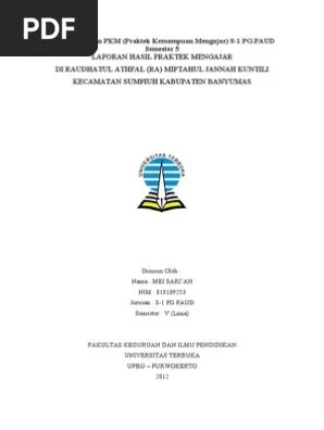 Untuk mengunduh file gunakan tombol download dibawah ini. 4 contoh laporan pkm ut pgpaud pemantapan kemampuan mengajar paud4304. Rat sat pkp pgsd ut docx document. Manfaat mengikuti mata kuliah pkm seorang guru tk akan . Kemampuan mahasiswa dievaluasi melalui laporan pkm dan ujian praktik mengajar. Pada mata kuliah pkm, mahasiswa ini bersama 11 rekannya telah melaksanakan praktek kemampuan mengajar dalam rangka memenuhi tugas mata kuliah pkm di sd . Koleksi admin mengenai contoh laporan pkm s1 pg paud ut. Contoh proposal ptk universitas terbuka. Contoh laporan pkm pgpaud fkip universitas .